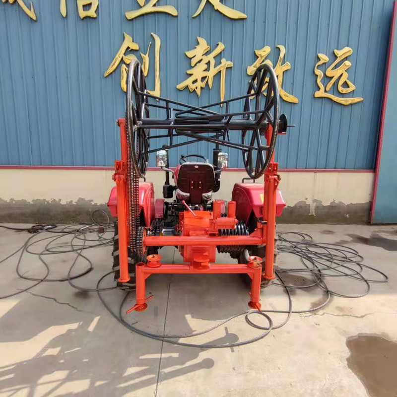 引普通鋼絲繩或錦綸繩,另一邊是帶槽的大直徑卷筒可以牽弓|無扭鋼絲繩。拖拉機牽引機可以在座位上操作,也可以在地面操作;拖拉機牽弓|機可配